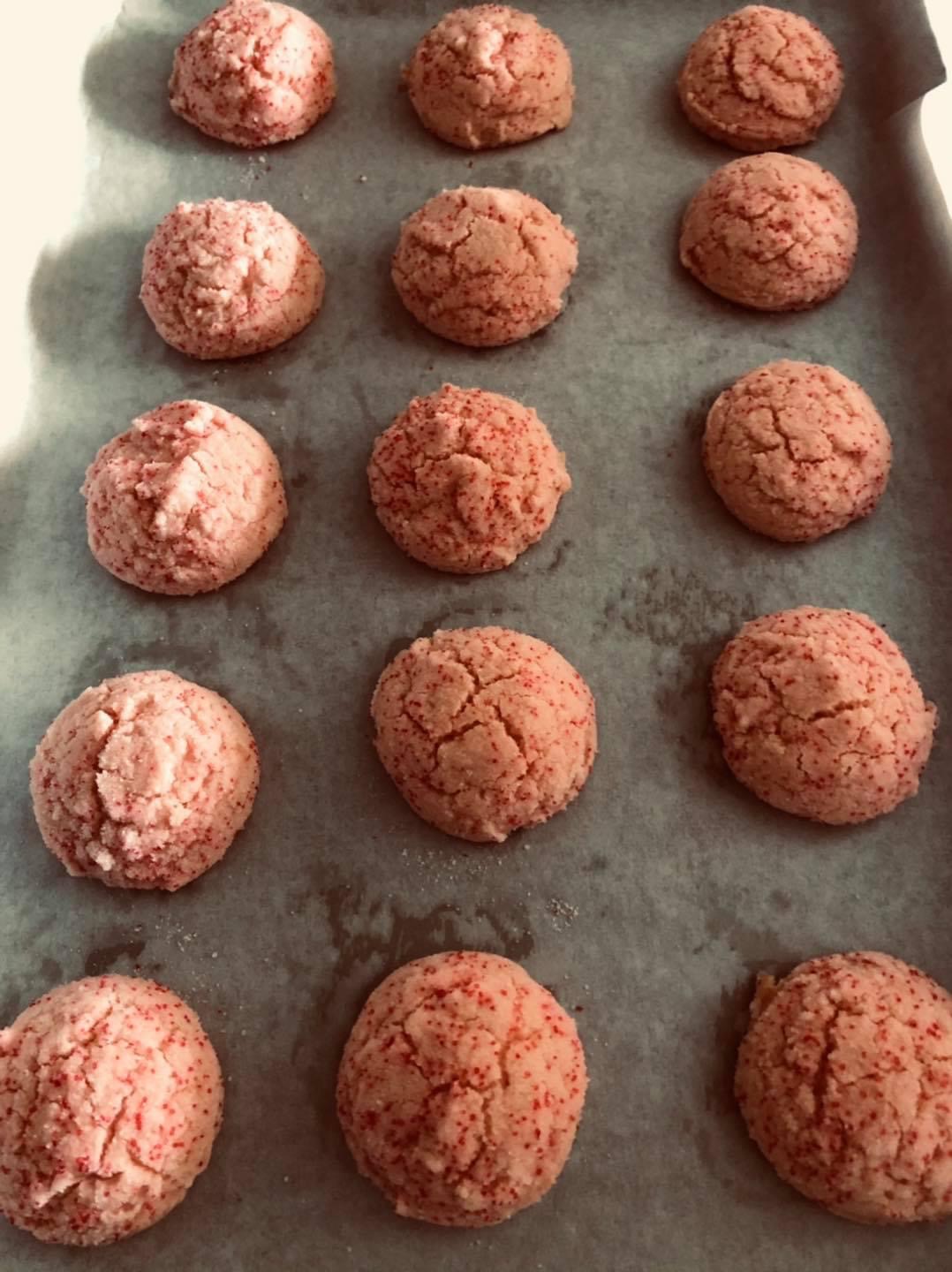 Feel free to experiment with the recipe and adjust the quantities of champagne and strawberry extract to suit your taste. Also if you want to do the “Trifecta ” add a Herseys Kiss to the middle while it cools on the rack. Plus I also rolled mine in a red sugar dust. Enjoy your sweet and tangy cookies!