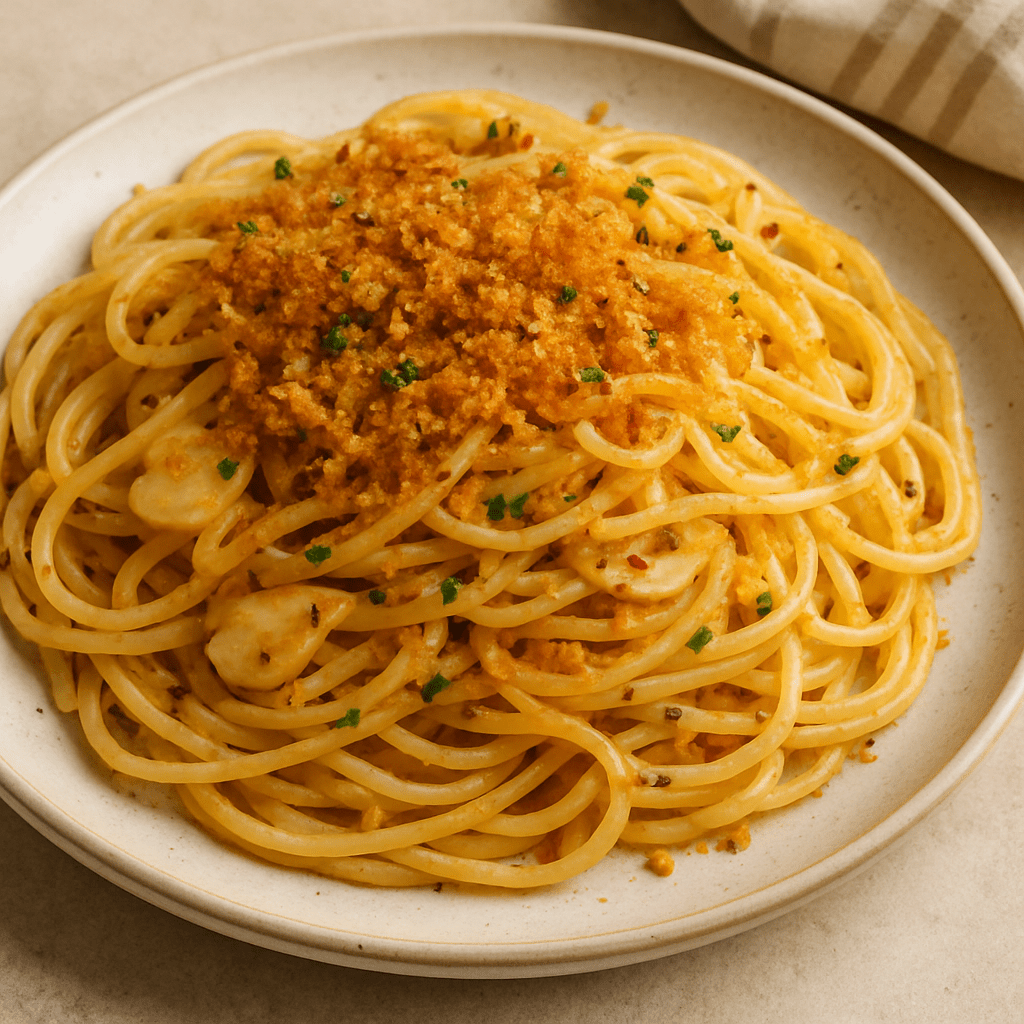 Serve and top: Plate the pasta and sprinkle with the crispy breadcrumbs for crunch. Top with grated Parmesan or nutritional yeast for an extra savory boost.