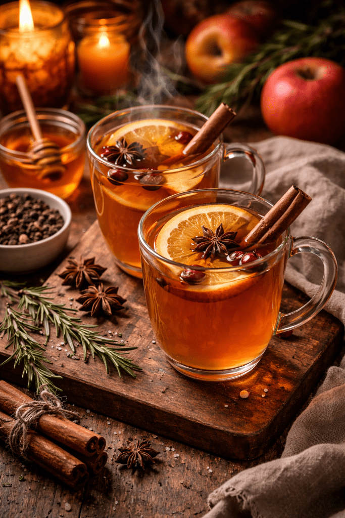 Combine all ingredients in a saucepan. Bring just to a simmer, then reduce heat and gently steep for 15–20 minutes. Strain and serve warm in mugs. Optional: Add a splash of brandy or dark rum for an evening version.