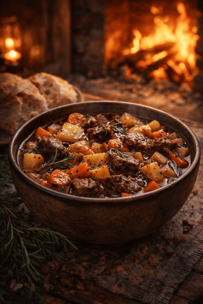 Heat oil in a heavy pot over medium heat. Brown the meat on all sides; remove and set aside. Add onion and garlic to the pot and sauté until fragrant and translucent. Stir in tomato paste, thyme, rosemary, and bay leaf. Return meat to the pot and add root vegetables and broth. Bring to a simmer, cover, and cook gently for 1½–2 hours (45 minutes for vegetarian version), until tender and rich. Season to taste and serve hot with crusty bread.