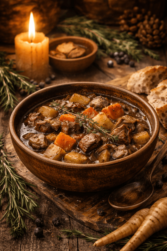 This stew is rooted and sustaining, honoring protection, care, and quiet endurance. It may be made with venison in honor of the Mother Deer, or easily adapted with mushrooms or beans for a plant-based hearth meal.