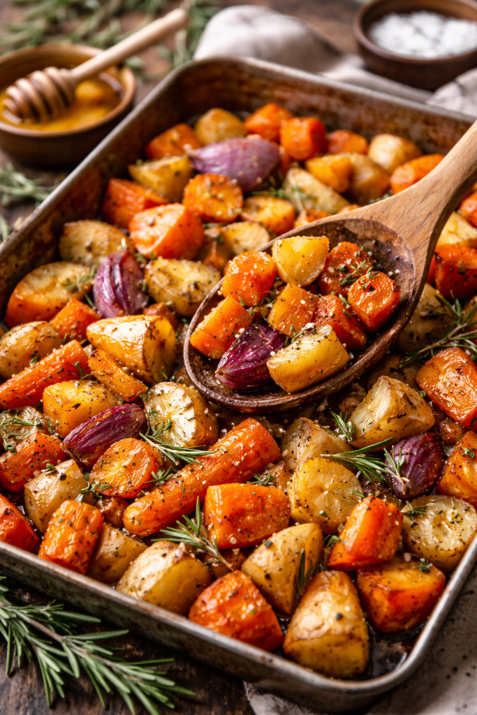 Preheat oven to 400°F (205°C). Toss vegetables with olive oil, honey, herbs, salt, and pepper. Spread evenly on a baking sheet. Roast for 30–40 minutes, stirring once, until tender and caramelized. Serve warm, giving thanks for the earth’s quiet abundance.