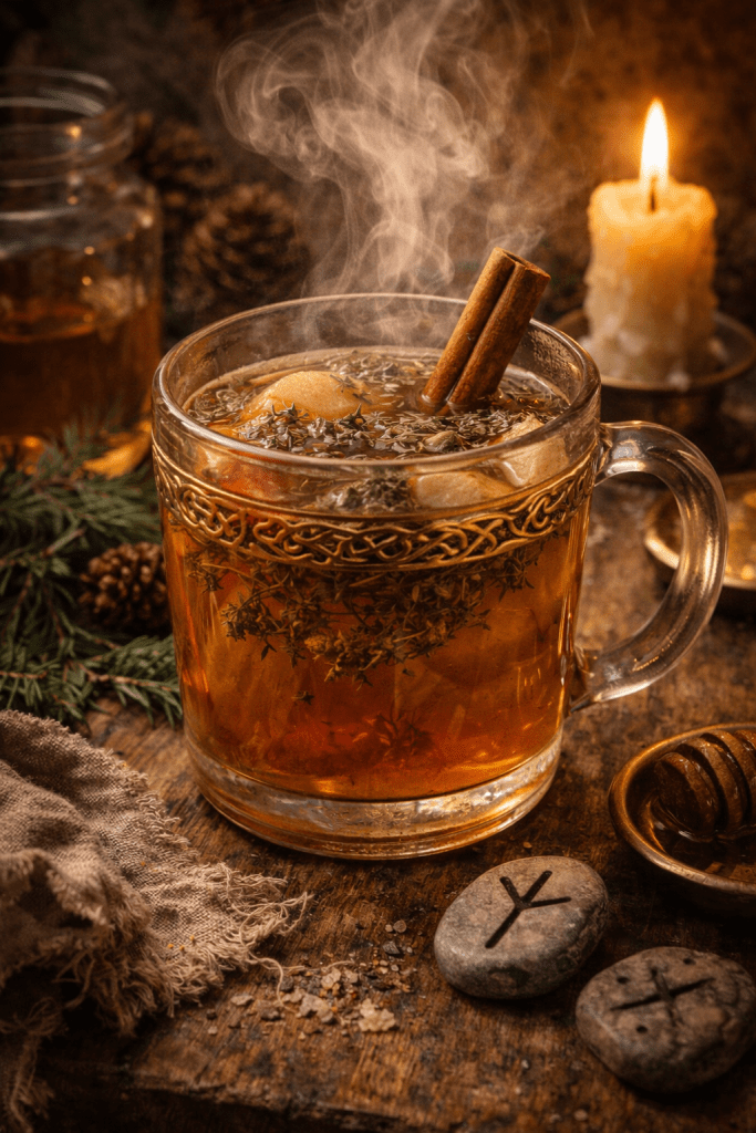 Warm apple cider gently over low heat. Add cinnamon, ginger, and herbs. Simmer very gently for 10–15 minutes. Strain into a mug and sweeten lightly with honey.