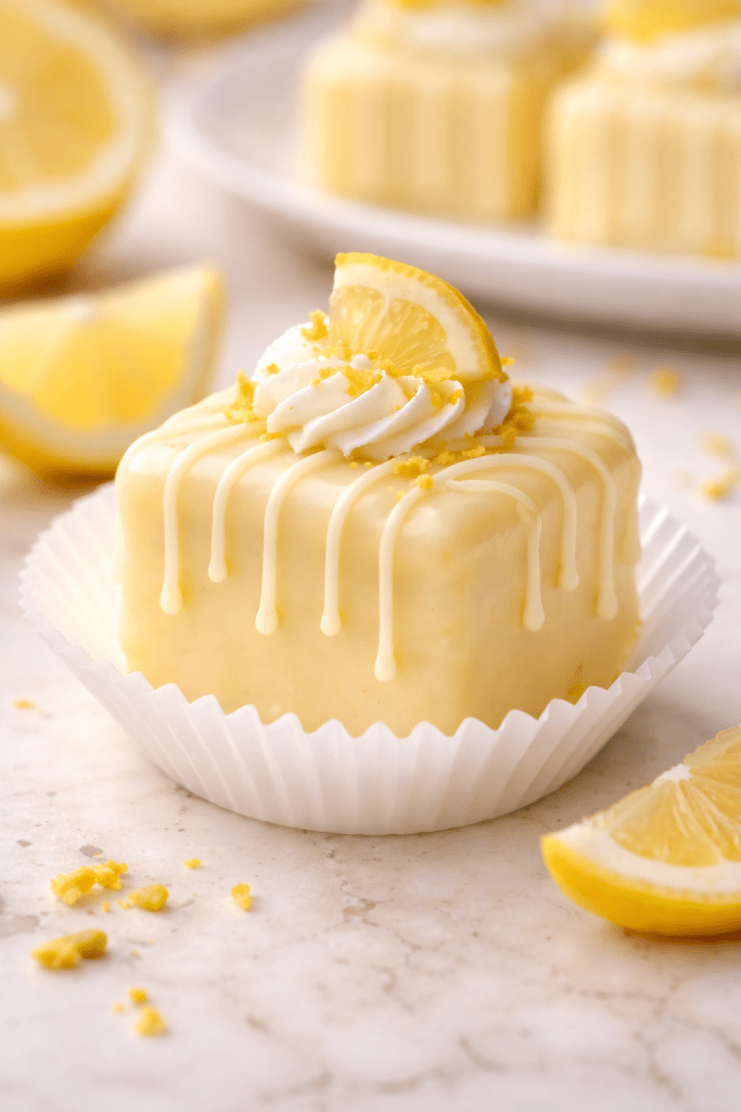 Bake cake in a sheet pan according to package instructions with lemon zest added. Cool completely and slice horizontally. Spread lemon curd and whipped cream between layers. Freeze cake for 1 hour to firm it up. Cut into small squares. Mix powdered sugar, lemon juice, and milk to create a thick glaze. Pour glaze over cakes. Garnish with: candied lemon peel white chocolate drizzle fresh berries.
